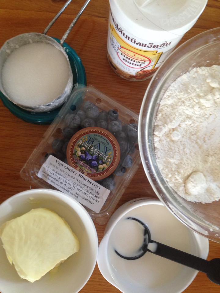 Đánh bơ với đường cho tan, thêm vỏ chanh nạo, đánh hòa quyện. Cho trứng gà đánh tan, thêm vani vào đánh đều. Cho từng ít bột, buttermilk vào đánh xen kẽ cho đến khi hết nguyên liệu. Cho blueberry vào, dùng phới dẹt đảo đều.
